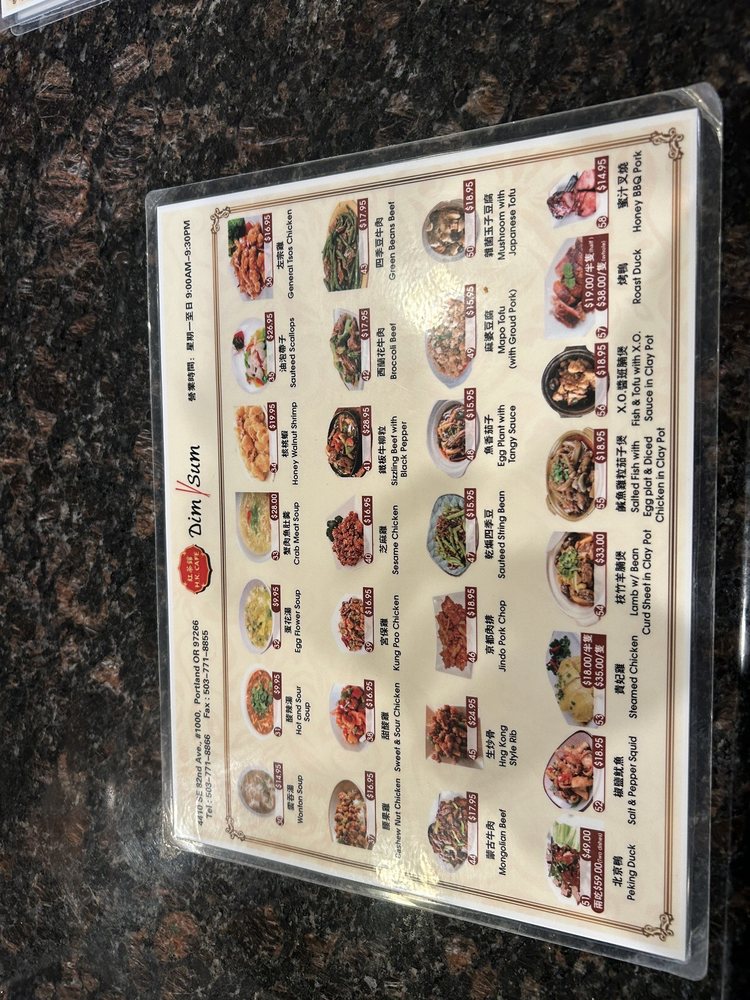 The menu boasts an array of appetizers and dumplings like Steamed BBQ Pork Buns and Shrimp Rice Noodles, along with flavorful soups such as Wonton and Hot and Sour. Entrees range from Honey Walnut Shrimp to Peking Duck, showcasing a range of traditional Cantonese dishes.